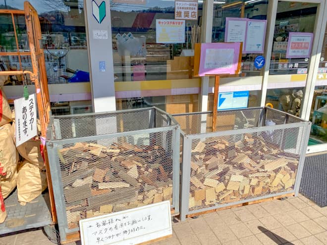 中津川河川敷で焚き火を楽しみたい時は、近くの個人商店「とくらや」で薪を調達することをおすすめします。河川敷には軽トラックで薪を売りに来ている薪屋さんもいますが、とくらやで薪や炭を購入すると、レジ袋に廃材つめ放題のお得なプレゼントが貰えます。