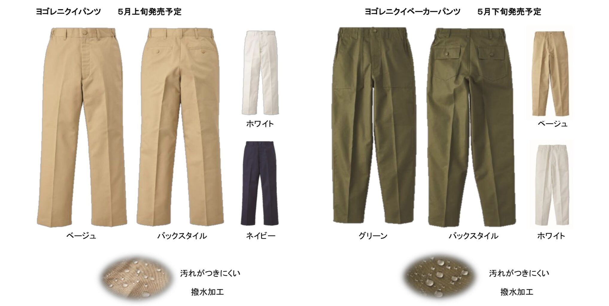 カラーは、「ヨゴレニクイパンツ」が、ホワイト、ネイビー、ベージュの3色で5月上旬の発売を予定。「ヨゴレニクイベーカーパンツ」は、ホワイト、グリーン、ベージュの展開で、5月下旬発売予定。