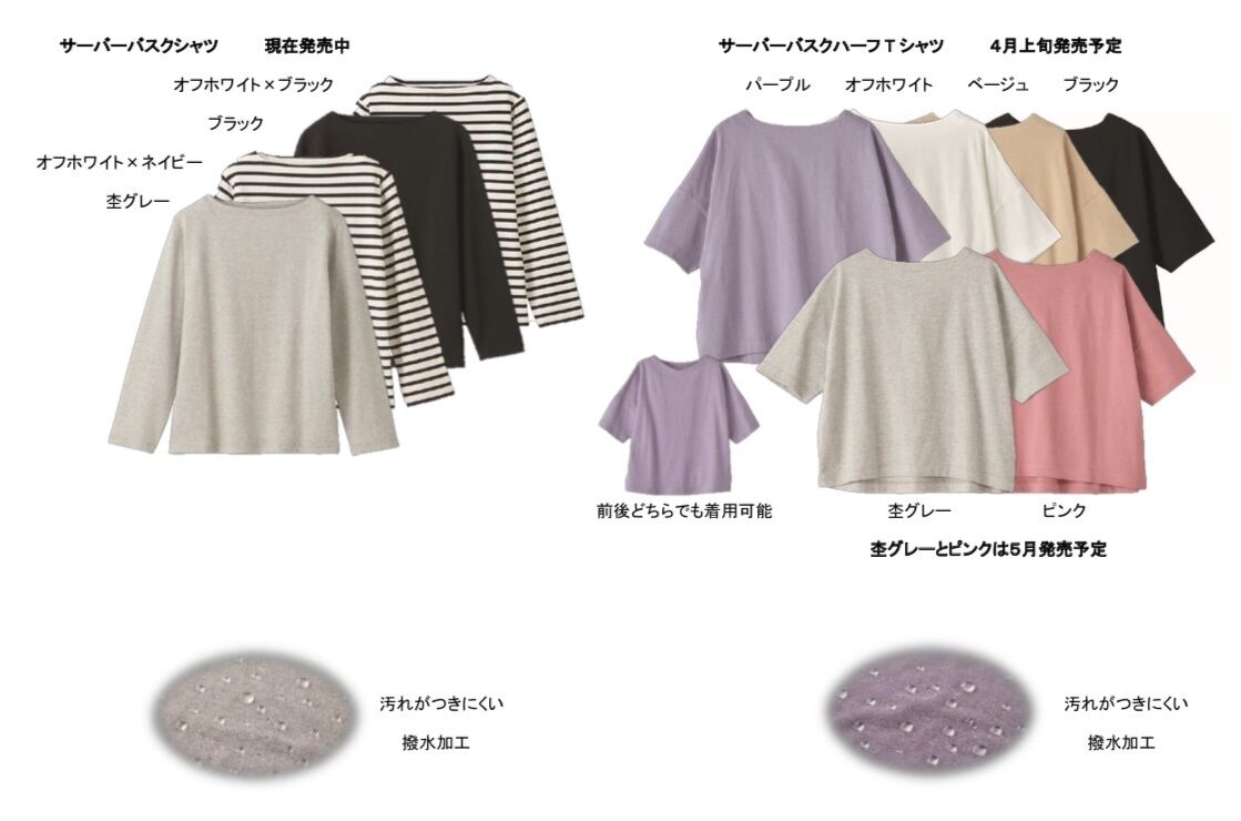 「サーバーバスクシャツ」のカラーは、杢グレー、ブラック、オフホワイト×ブラック、オフホワイト×ネイビーの4色。「サーバーバスクハーフTシャツ」は、パープル、オフホワイト、ベージュ、ブラック、杢グレー、ピンクの6色展開で、4月上旬の発売を予定している。(杢グレー、ピンクのみ5月発売予定)