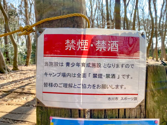 いちかわ市民キャンプ場は青少年の育成を目的とした施設になっていますので、キャンプ場内は全面「禁煙・禁酒」となっています。また林間サイトは火事の恐れがあるため、サイト内の焚き火も禁止されています。