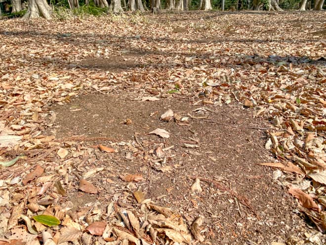 地面は硬すぎない土サイトで、ペグ打ちも苦労せずにしっかり固定されます。アルミペグでも問題ありません。ただ、ところどころモグラの穴がもこもこしており、その周囲はとても柔らかく耕されているので、設営する時は地面をしっかりチェックして穴を避けるようにしましょう。