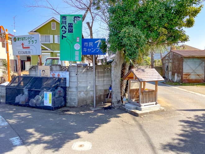 正しい入口は写真の「市川ペット霊園」の脇道を入っていくルートになりますので、Google MAPでナビを入れる際はそちらを目指すようにして下さい。また市道からの入口の看板はとても分かりにくいので注意して下さい。