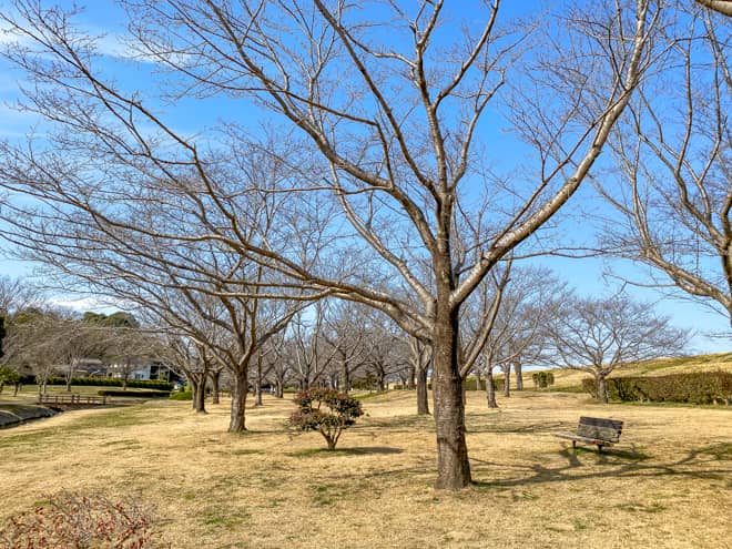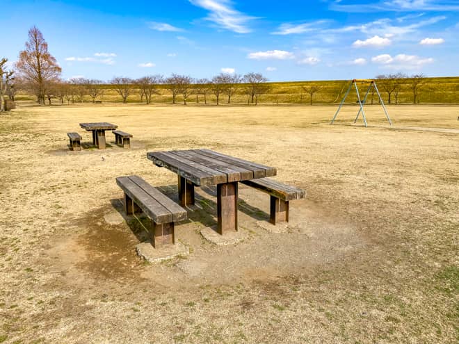 野田市スポーツ公園の広場奥には桜並木が続いており、その下にはベンチも設置されています。桜の季節には、桜の下にテントを張ってお花見デイキャンプを楽しむ人たちが多く訪れる人気のスポットになります。