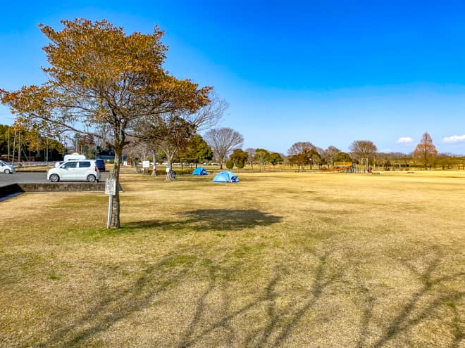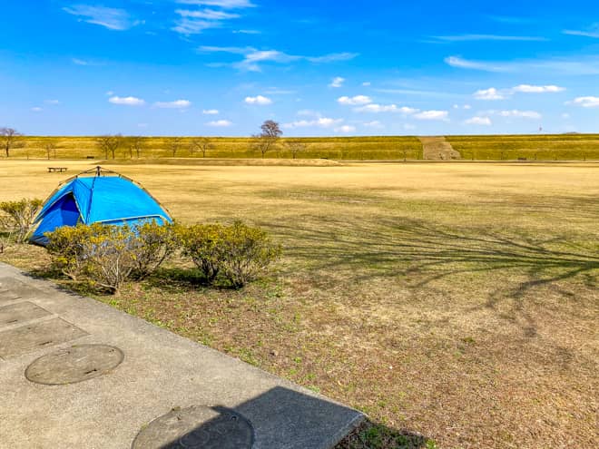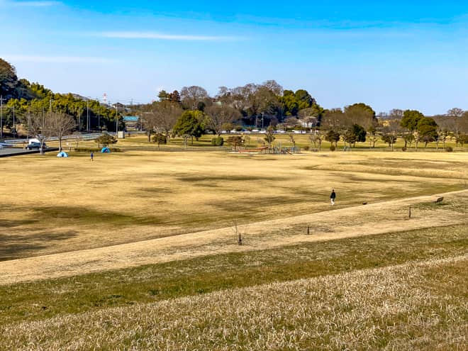 野田市スポーツ公園は一面の芝生が気持ちいい芝生広場(イベント広場)と、土手の反対側にある利根川の河川敷に広がる多目的広場に分かれています。こちらでは、テントやタープを張ってデイキャンプやピクニックが楽しめる芝生広場を中心にご紹介します。