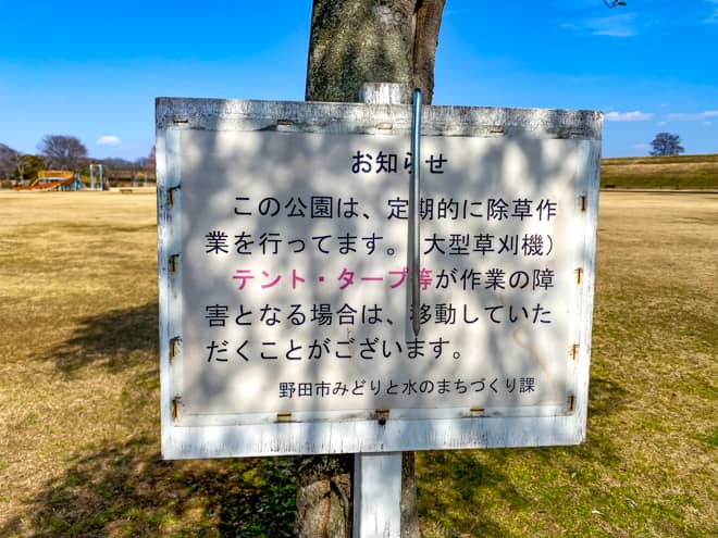 野田市スポーツ公園は数年前までキャンプやバーベキュー目的で賑わっていた場所ですが、ゴミの不法投棄や迷惑行為によって残念ながら火気使用が禁止となってしまいました。そのため、今では週末でも利用者が少なく、子供連れでものんびりと過ごせる広場として生まれ変わりました。
