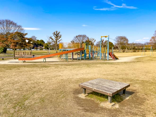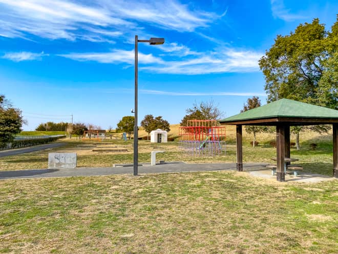 野田市スポーツ公園の第二駐車場側の広場に、子供が大好きなターザンロープやローラー滑り台のある大型遊具が設置されています。他にも、第一駐車場を進んだ先にある多目的広場にはジャングルジムやブランコ、シーソーなどの定番遊具も置かれています。すぐ側には親が見守れる東屋があるのも嬉しいですね。