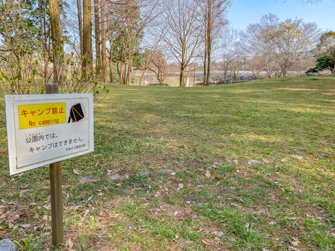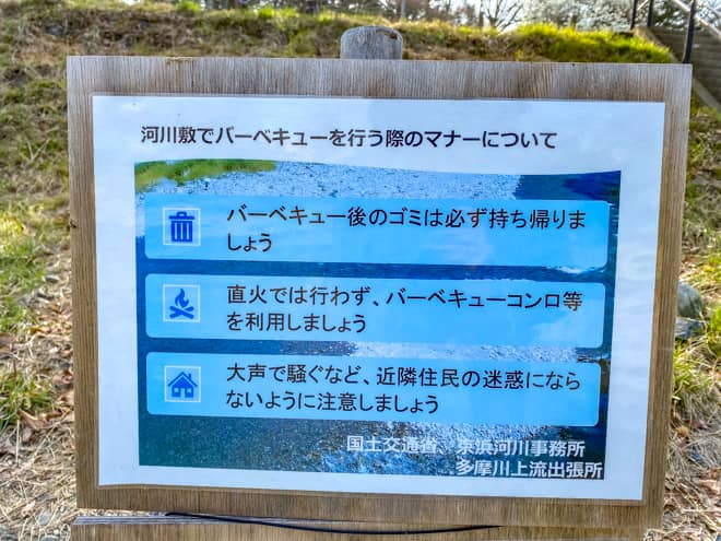 河川敷でのキャンプは明確に禁止されていませんが、釜の淵公園内でのキャンプは禁止されています。公園内にある芝生広場は、子供たちが遊んだりレジャーシートを広げてピクニックを楽しむためのスペースとなっています。もちろん火器使用も禁止されています。