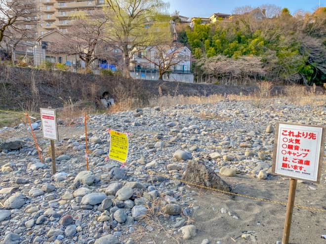 河川敷にはトラロープ(黒と黄色のロープ)で区切られたエリアが有り、その中での火器の使用やキャンプは禁止されています。特に民家に近いエリアとなるので、大音量で音楽を流したりするのもNGです。国土交通省によると、苦情の入りやすいエリアなので利用には細心の注意をして欲しいということでした。