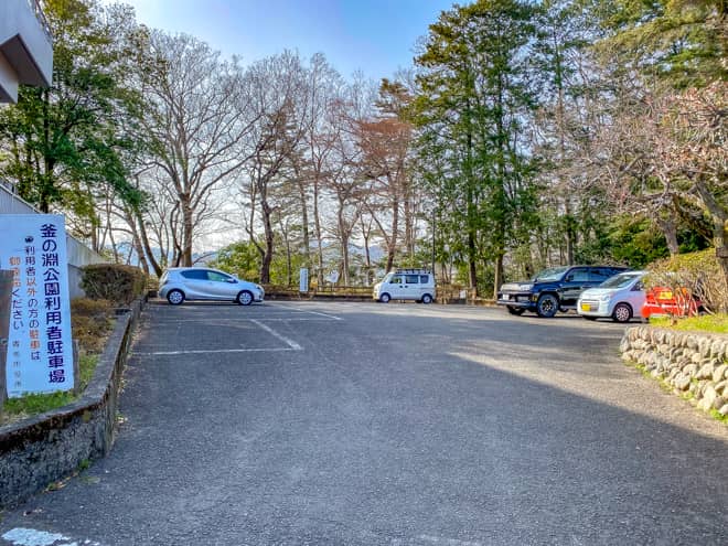 釜の縁公園利用者駐車場は、無料で使えて10台程度が止められる小さな駐車場です。非常に狭い駐車場なので、バーベキュー利用者が増える夏シーズンはすぐに満車になってしまいますが、シーズン外の平日であれば余裕を持って利用できると思います。