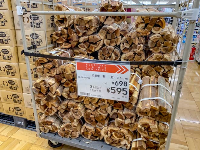 カインズ飯能武蔵丘店では、広葉樹の薪が1束698円、3束以上で1束595円。その他、針葉樹の薪が748円、バーベキュー用木炭が798円で販売されていました。焚き火やバーベキューで使えるチェアやバーベキューコンロなどの販売もされていますので、何か足りないものがあった時はこちらで揃えられると思います。