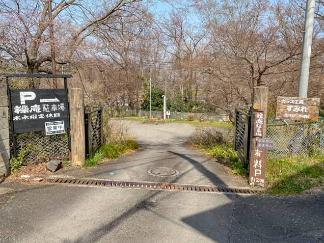 飯能河原に一番近い駐車場がこちらの「ガラス工房すみれ」が運営している櫟庵(くぬぎあん)駐車場です。営業時間は水曜日を除く11時~17時まで、宿泊は出来ません。ガラス工房すみれの店先に20台程度を駐車できるスペースが有り、車は1日1200円、バイクは500円で駐車可能です。