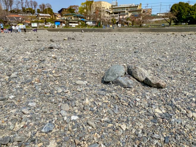 飯能河原はゴロゴロとした石が転がる石河原となっていて、地面も非常に硬く、テント設営のためのペグ打ちは特に苦労しそうです。テントやタープを設営するなら、なるべく丈夫な鍛造ペグを準備しておいた方が安心です。なるべく大きな石を取り除いて、整地してから設営することをおすすめします。