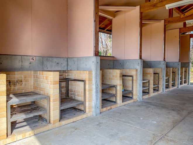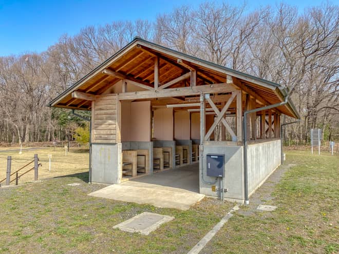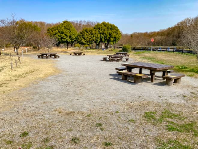 所沢カルチャーパークにはキャンプ場の他にもデイキャンプ場が設置されています。こちらは砂地のバーベキュー広場といった感じですが、椅子とテーブルが設置されているので、コンロと炭と食材を用意しておけば気軽にバーベキューが楽しめます。