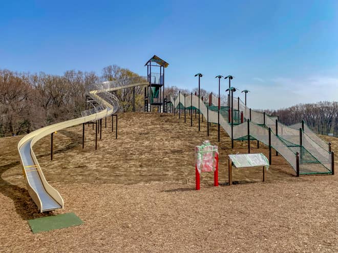 2022年4月から、所沢カルチャーパーク内に巨大アスレチックが新たに誕生しました。現地取材時はまだ整備中でしたが、元々は原っぱ広場(芝生広場)だったエリアに築山が作られて、その上にローラー滑り台とクライミングネット等で構成された複合遊具が設置されています。