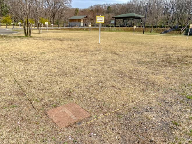 所沢カルチャーパークのテントサイトは、柵やロープなどで分かりやすいように区画分けがされています。テントサイトには木陰が無いので、夏場や日差しの厳しい日にはタープなども用意して張りたいですが、ツールームテントを設営すると一杯いっぱいといった感じのスペースです。同一グループによる複数区画のご予約はできないので、スペースを広く使いたい場合は管理事務所に相談してみましょう。