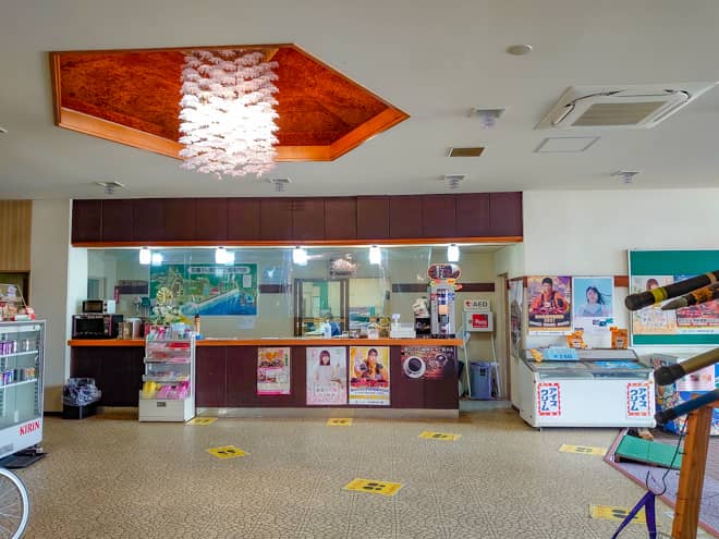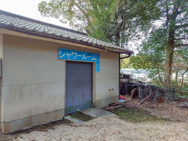 事前受付が必要で、この日は予約をしている人がいなかったのでシャッターは閉まっていました。見た目が古い建物ですがシャワーブース内はユニット式で綺麗です(1回440円)。夏期のみ管理棟内のお風呂が開いているので、夏は入浴もできます(大人440円、幼児220円)。