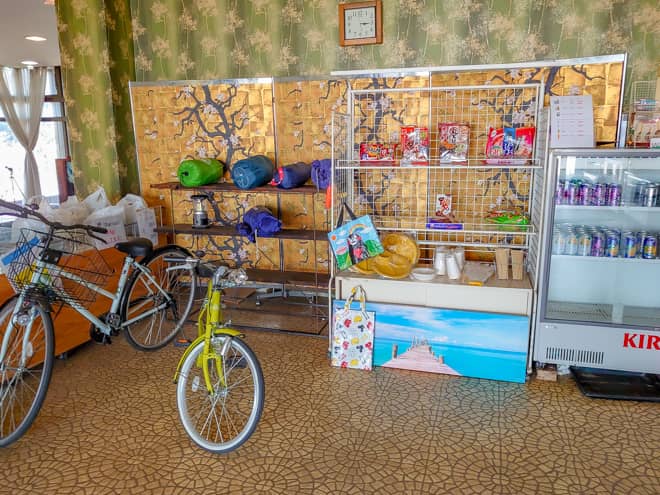 チェックインはこちらで行います。品数は多くないですがお酒、カップラーメン、お菓子などもこちらで購入可能。薪や炭も販売しています。レンタル品も充実しておりキャンプ用品はもちろん、自転車や釣り道具もありました。