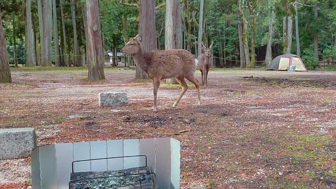 キャンプ場内に柵が無いので、鹿が普通に歩いています。特に食べ物があると近寄ってくるので、食べ物は放置しない事が重要です。