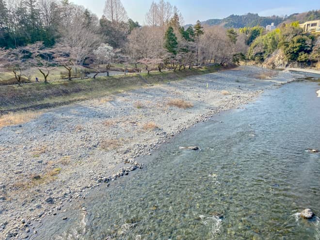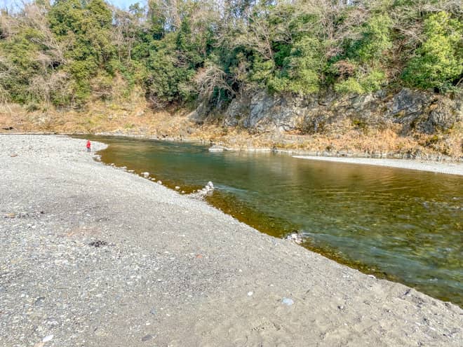 柚木の川原から少し下流に、野営の可能な「釜の淵公園河川敷」があります。こちらは駐車場から河川敷に降りていくまでに距離が有り、道具の持ち込みが大変ではありますが、夏以外のオフシーズンであれば利用者も少なく静かにゆったりとキャンプを楽しめる、知る人ぞ知る穴場のスポットです。予約不要で利用可能ですが、管理人がいない場所なので、どれだけマナーを守った使用が出来るかモラルの有る行動が強く求められる場所です。