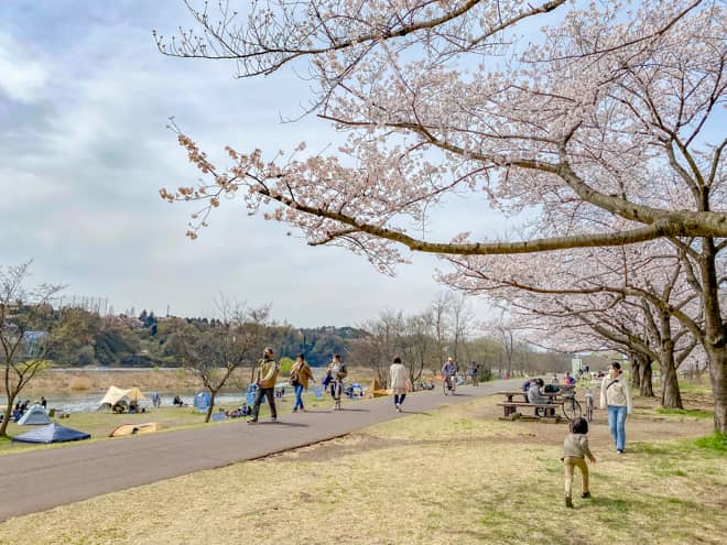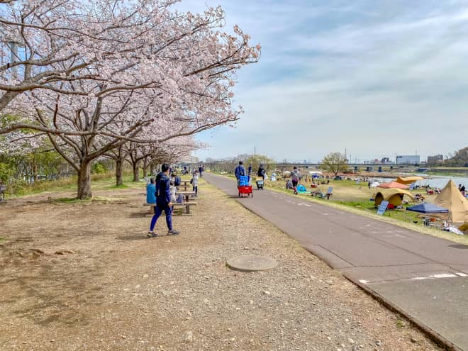 土手上は「府中多摩川かぜのみち」というサイクリングロードになっていて、ウォーキングやサイクリングを楽しむ人たちがとても多く行き交っています。駐車場からバーベキュー場までこの道を横断する形になるので、荷物の搬入時には自転車に気を付けて下さい。