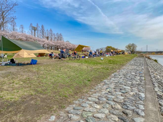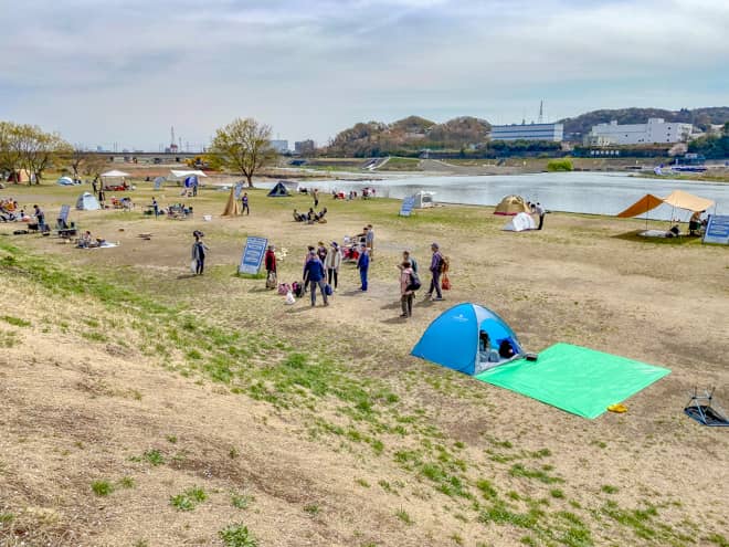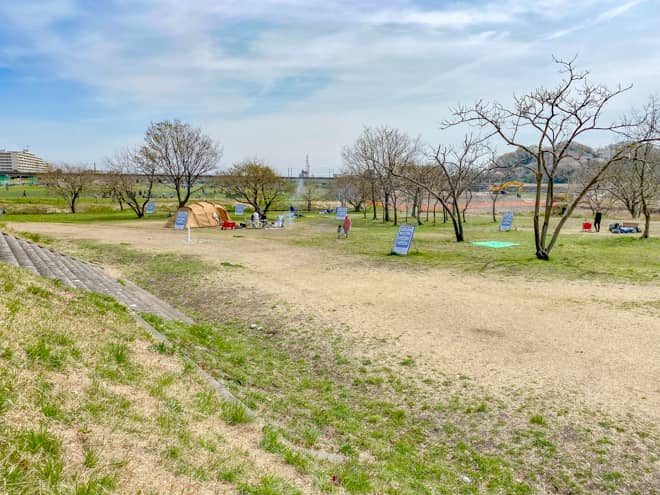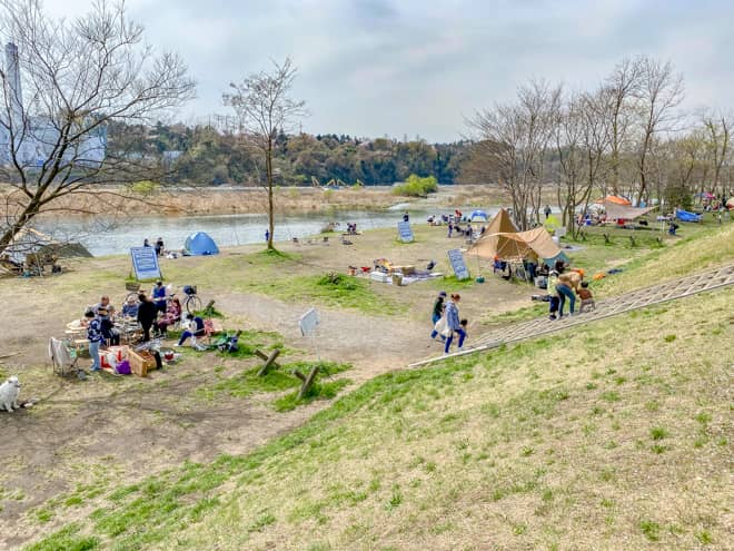 郷土の森公園バーベキュー場のキャンプ可能エリアは、多摩川に沿って広範囲に広がっています。土日に訪れても、混雑しすぎでスペースが無いという印象はありませんでした。それぞれが密集しすぎないように距離を取って設営されているので、隣が近すぎて不快な思いをするということも少なそうです。