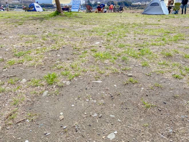 地面の様子は、土がむき出しになっている部分と草地になっている部分でまだらになっている状態です。ペグ打ちについてはそこまで苦労しないでしょう。傾斜も無く平坦ですので、設営時も好きな場所を選べます。