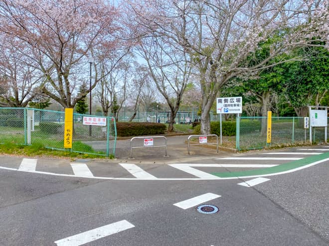 「四街道総合公園キャンプ場」をGoogleMAPでナビに入れると、こちらの南側駐車場(臨時駐車場)入口に案内されますが、イベント開催時以外は臨時駐車場は開いていないので、看板で示されている左の道には行かず、写真右の方面に進んで東門から入場するようにして下さい。