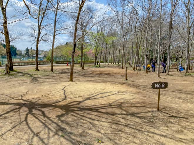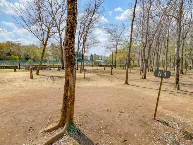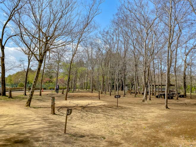 テントサイトは区画毎に札が立てられており、盛り土のされたサイトになっています。公園利用者も自由に立ち入りが可能なスペースですので、プライベート感を楽しむという感じではありません。広さも狭いので、大型テントやタープ設営は厳しそうです。