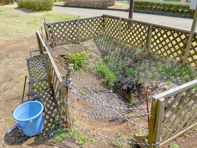 カマドを使った後の炭や灰はこちらに捨てて、消火用バケツで水を掛けて完全に消火するようにして下さい。