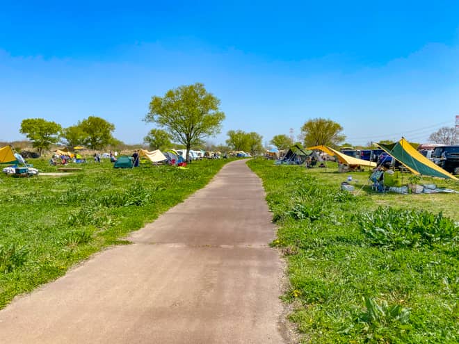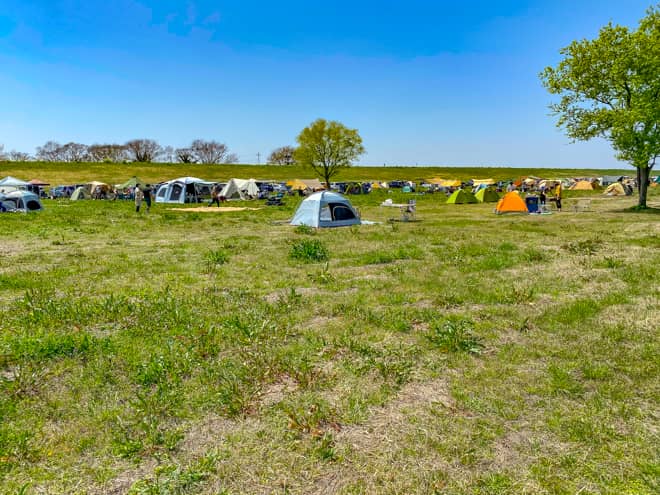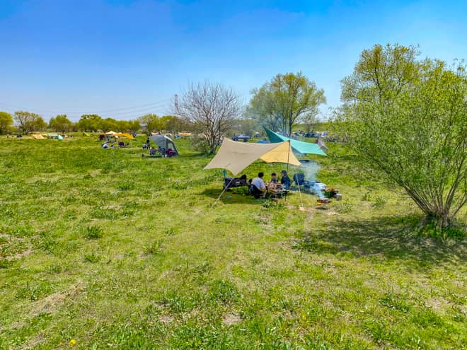 利根川の河川敷という区域ではありますが、テントサイトから川は見えないので、草原の広場でキャンプをしていると感じられるほど解放感に満たされています。