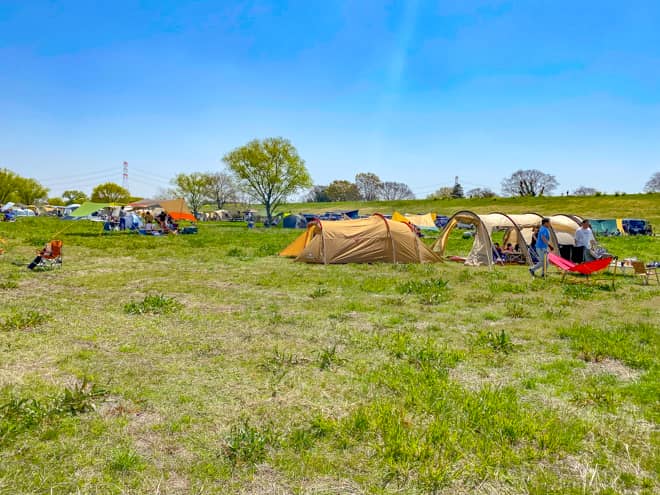 利根川ゆうゆう公園デイキャンプ広場は草地の広大なスペースとなっており、エリア内であればどこでも好きな場所にテントを設営してデイキャンプが楽しめます。