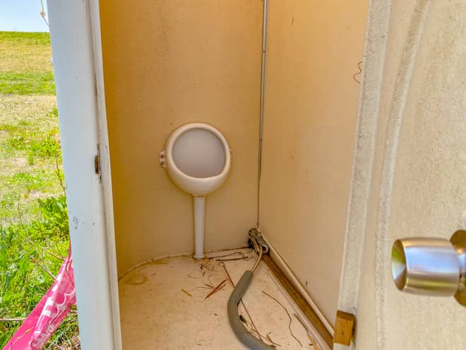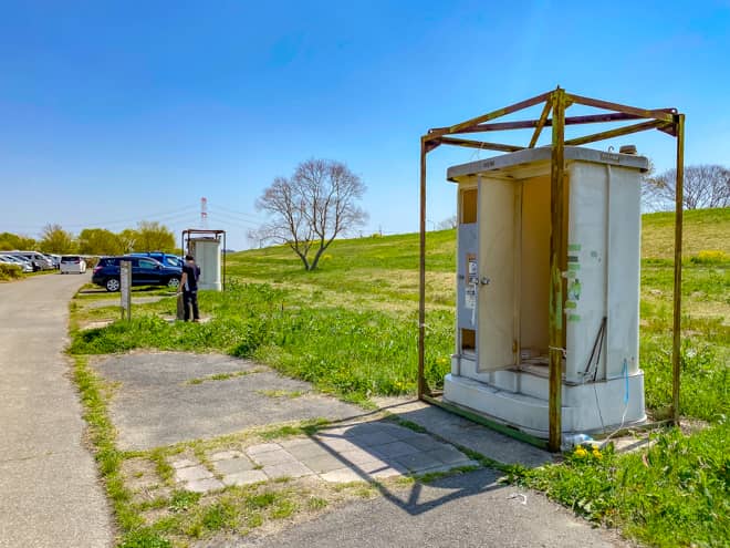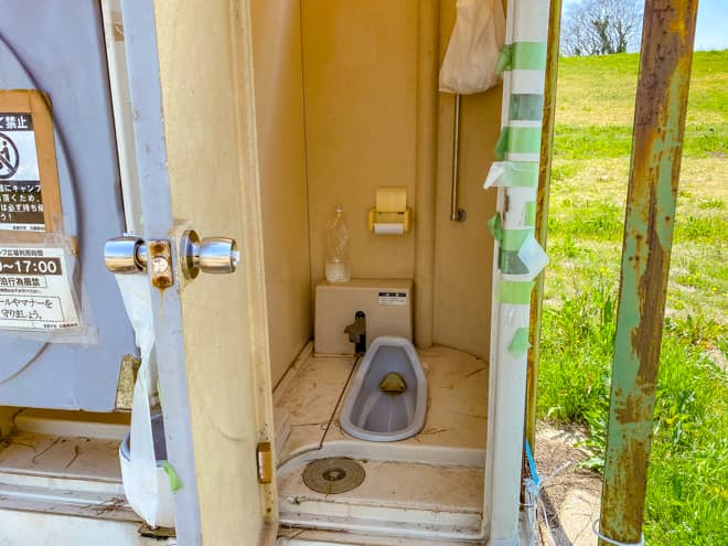 洗い場の隣には仮設トイレが合計4つ設置されています。ただし、利用者数に対してトイレの数が圧倒的に少なく、汚れもそうですが臭いがキツく感じられる状態でした。苦手な人にとっては、ちょっと厳しいトイレだというのが正直な感想。土日はトイレ待ちの並びも有ります。