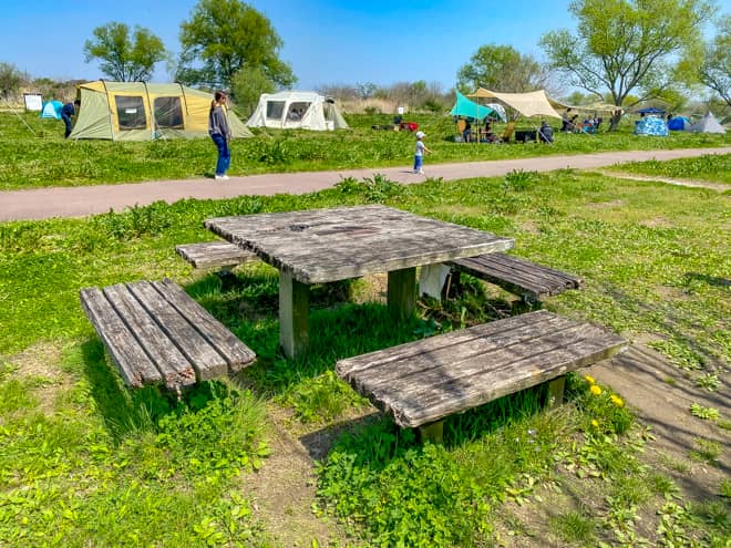 利根川ゆうゆう公園デイキャンプ広場には野外卓として12基のテーブル・ベンチが設置されています(うち車イスで利用可能2基)。利用者が少ない平日などは、この近くにテントを設営すれば、荷物も少なくデイキャンプやバーベキューが楽しめそうです。