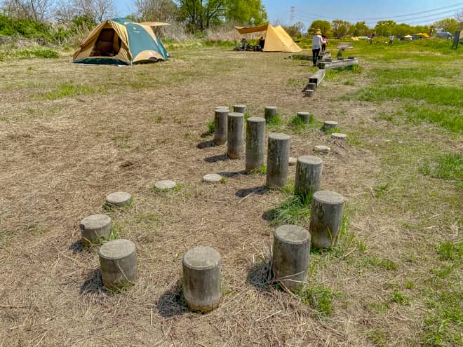 デイキャンプ広場の一部には丸太渡りができる木製遊具が設置されています。本格的な遊具では無いですが、幼児と一緒に遊んだりするのには良いかも知れません。この日も、3~4歳の子どもと一緒に遊んでいるファミリーキャンパーさんを見かけました。