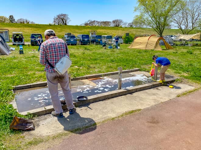 デイキャンプ広場の一ヵ所に水道が設置されていますが、水の流れが悪いのか、それとも生ごみや油汚れなどを流す人が居ることで詰まってしまったのか、水たまりのような状態になっていました。