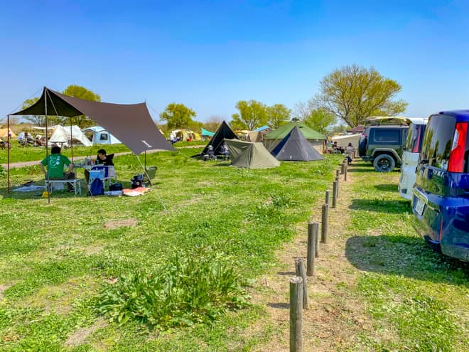 利根川ゆうゆう公園デイキャンプ広場には車の乗り入れは出来ません。しかし、駐車場のすぐ近くに設営が可能なので、空いていればオートキャンプのような距離感でキャンプを楽しめます。ただし、かなりの人気エリアとなっていますので確実に確保するなら8時半のオープンと同時の到着が求められます。