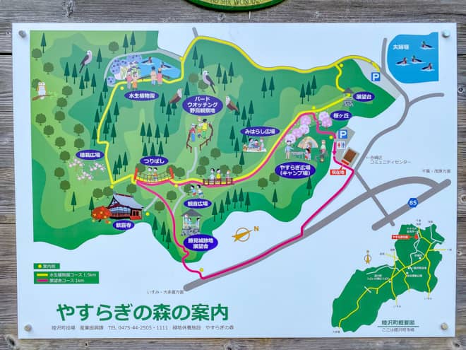 やすらぎの森はキャンプやハイキングを気軽に楽しめる、むつざわ町営の緑地休養施設です。キャンプのできる「やすらぎ広場」の他にも、野鳥観察地や水生植物園、九十九里浜を見渡せる展望台などが設置されています。