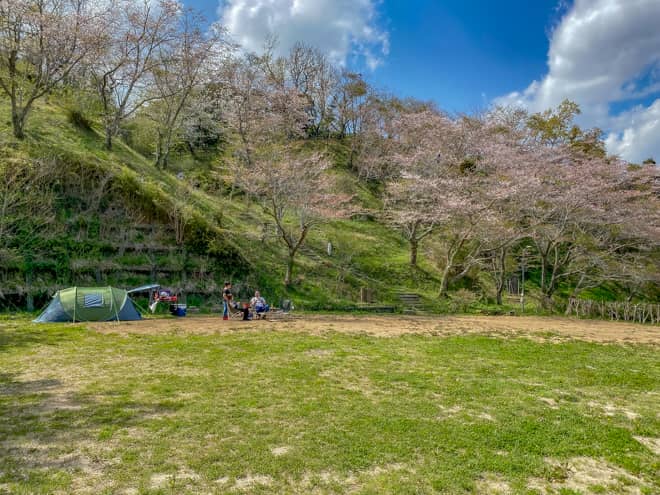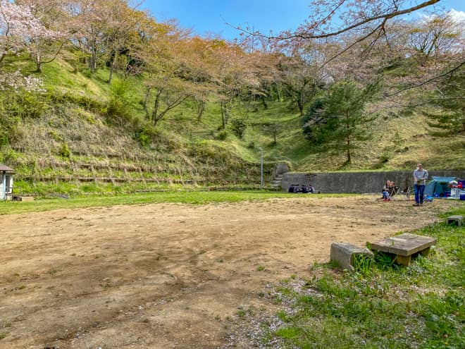 やすらぎ広場の敷地面積は狭く、6組ほどが設営したら一杯になってしまう程度ですが、2週間前に予約が必要なこともあって利用者は少なく、土日祝日でものんびりとした雰囲気の中でゆったりとキャンプを楽しめます。