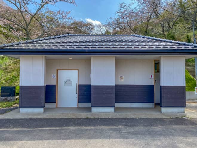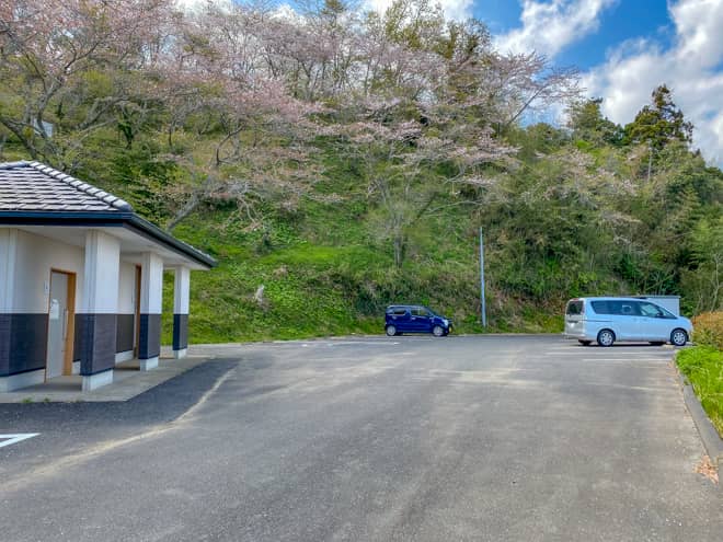 やすらぎの森キャンプ場には無料の駐車場が併設されています。10台ほどは停められるスペースが有り、駐車場には公衆トイレも設置されています。