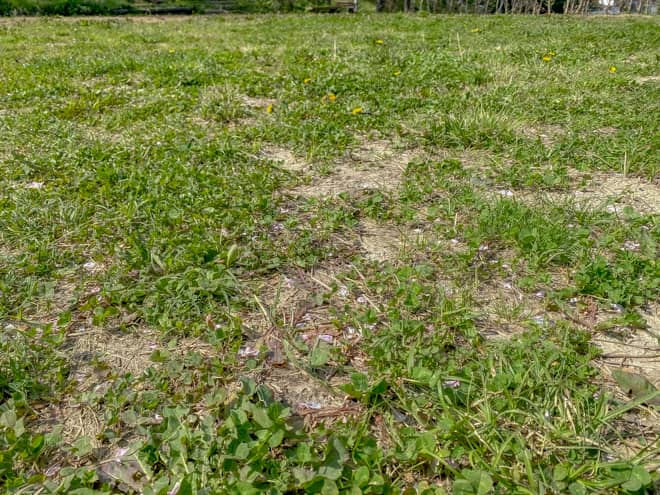 やすらぎの森キャンプ場のフィールドは草地と土が混じった地面です。傾斜はありませんので、テント設営は好きな場所を選んで可能。ペグ打ちもそこまで苦労することはないと思います。