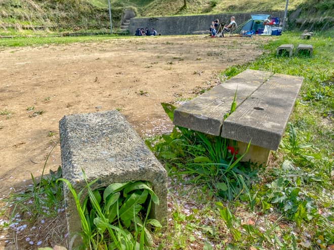 やすらぎの森キャンプ場には木製ベンチやU字ブロックが設置されています。アウトドア用チェアを持っていれば使用することはないと思いますが、荷物の少ない自転車旅やツーリングキャンプなどには重宝しそうです。