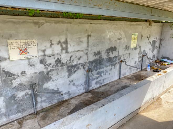 広場の一角には水道とカマドが設置された炊事場があります。かなり古びた設備で、まるで打ち捨てられたかのようなカマドには気が引けてしまいますが、せっかくの設備ですから綺麗に使いたいものですね。