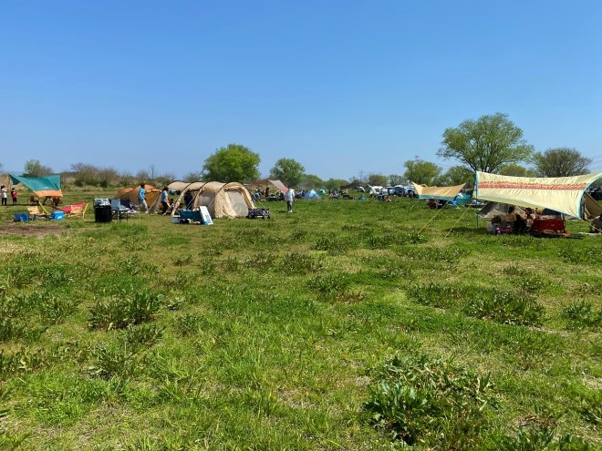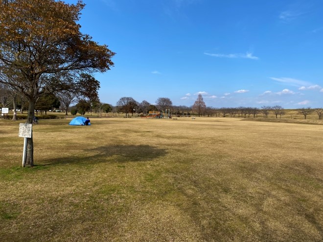 利根川ゆうゆう公園デイキャンプ広場は草地の広大なスペースとなっており、エリア内であればどこでも好きな場所にテントを設営してデイキャンプが楽しめます。利根川の河川敷という区域ではありますが、テントサイトから川は見えないので、草原の広場でキャンプをしていると感じられるほどの解放感に満たされています。