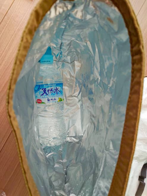 内側はアルミ蒸着。薄いですが断熱の役割を果たすフォーム材もしっかり入っています。筆者が使用しているLサイズは350ml缶であれば6本、500mlペットボトルは寝かせれば2本入ります。ペットボトル1本は保冷剤として凍らせて食材と一緒に入れておけば、気温や環境にもよりますがソロ用の食材に十分な保冷力。