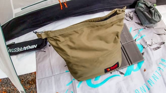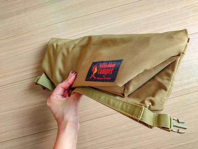 キャンプ後は折りたたんでバックパックに収納する事も可能。断熱材シートが入っていて少し嵩張るので、バックパックの容量に余裕が無い場合は厳しいと思いますが、元々コンパクトで軽量なのでサブバックとして手持ちしても邪魔になりません。筆者の場合、帰りはゴミ入れにして手持ちしています。