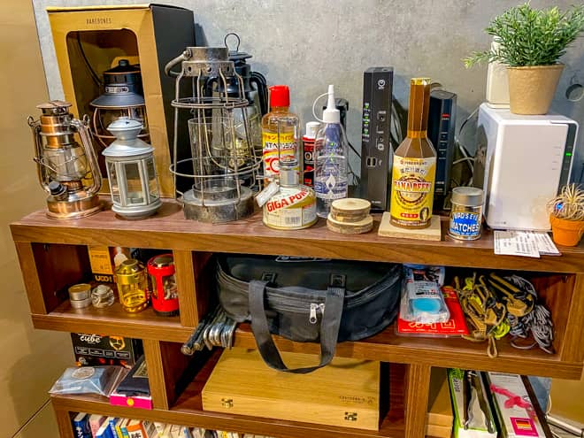 イメージ画像3(ランタンと一緒にルーターやモデムが並ぶ編集部の棚)