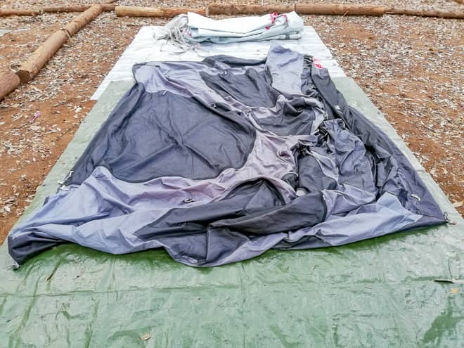 濡れたテントをしまうビニール袋と雑巾