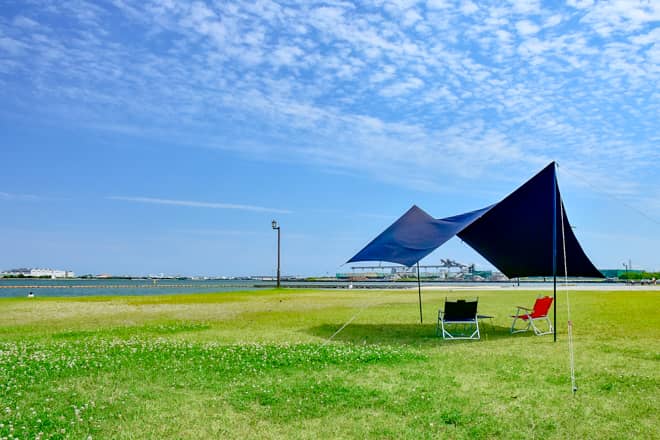 ソロキャンプでもファミキャンでも、テントの設営中は直射日光を浴びながらの作業です。ほんの数分動いただけで、額から汗が噴き出してきます。そんな時、テントの設営の前に、タープを設営してしまいましょう。