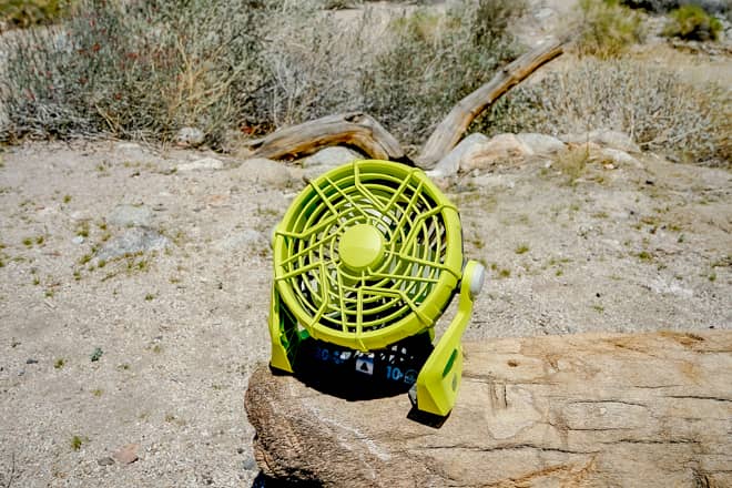 うちわよりポータブル扇風機、ポータブル扇風機よりコンセント式の扇風機やサーキュレーターがおすすめ。これがあるかないかで、夏キャンプの快適さが大きく変わってきます。