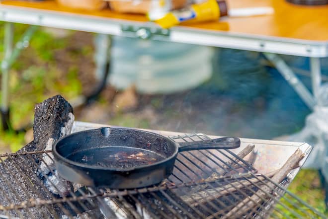 キャンプ料理で定番のアヒージョ。作り過ぎて余ってしまった油や、フライパンに溜まった肉汁なども吸い込ませてから捨てられます。ある程度綺麗にすれば、汚れた食器類も持ち帰りやすくなりますよね。